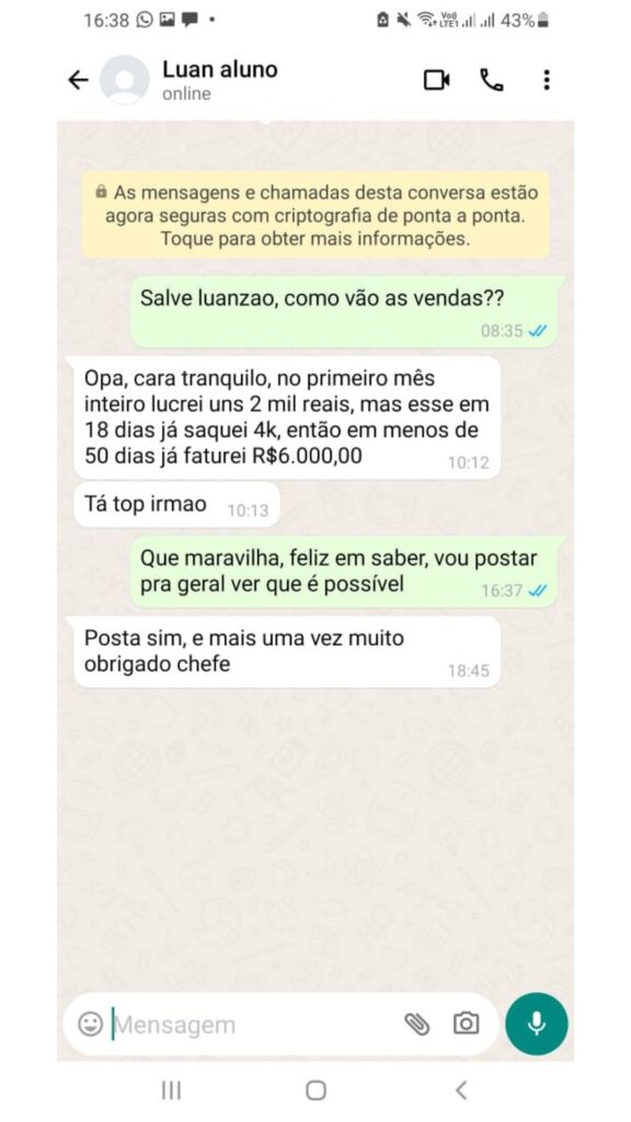 Um método simples e eficaz que te proporcionará resultados satisfatórios trabalhando de casa, utilizando apenas o seu celular e no tempo livre. Serve tanto para quem está em busca de uma renda extra de R$ 3.000,00 por mês como para quem deseja ser o próprio chefe e escalar os seus ganhos ultrapassando os R$ 10.000,00.